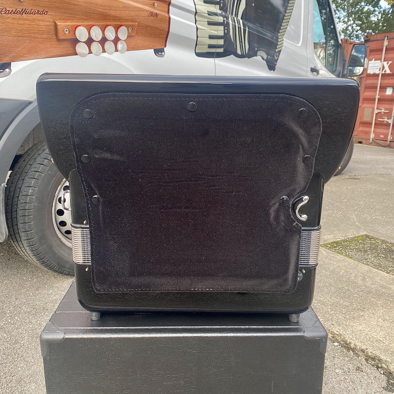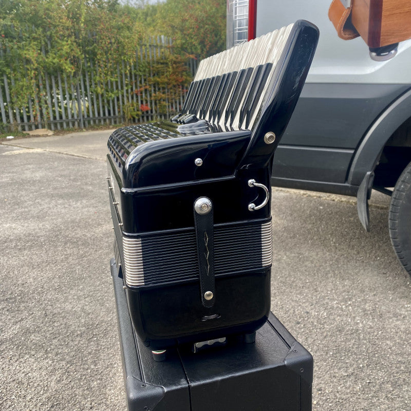 The left hand has been upgraded to a 96 bass and has 5 registers instead of the usual 2. This gives you a huge range of tone colours to really balance your sound between the hands. On top of this the way the sound projects from the left hand has been focused by the addition of sound scrolls on the front of the instrument. Combine this with a solid side plate the sound is projected forwards in the same way the right hand is. This makes this instrument wonderfully composed and directed towards the best sound for the audience