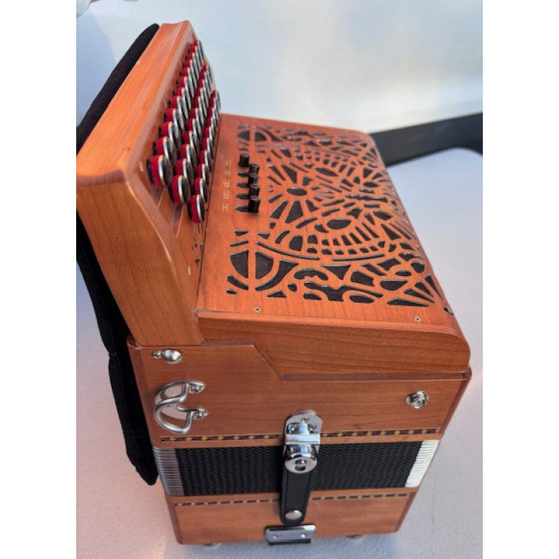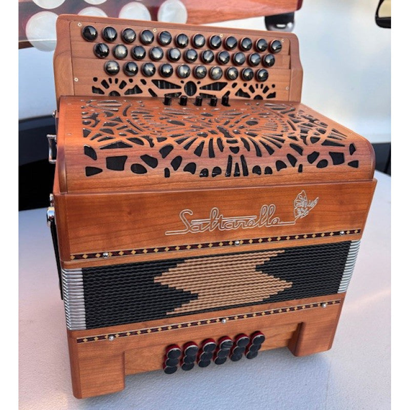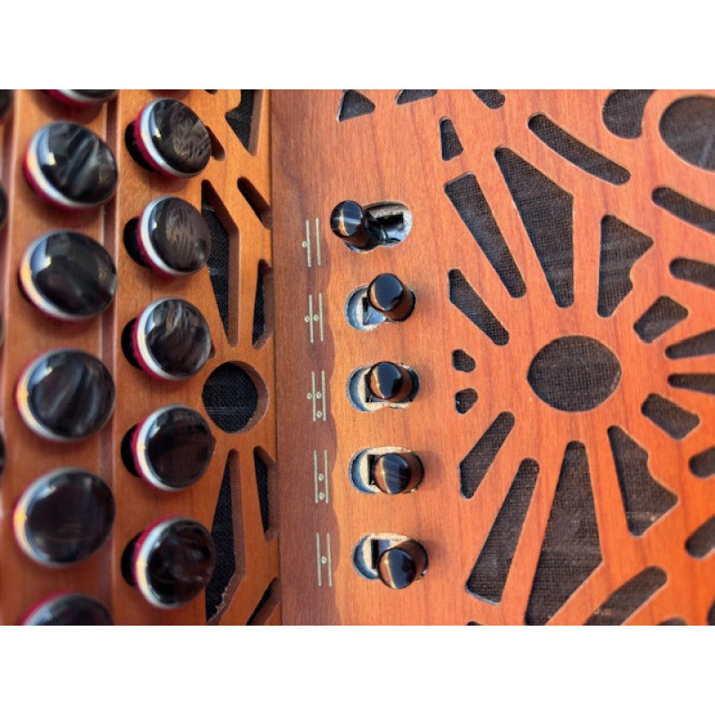3 rows, 33 treble buttons, 3 voices, 3 voices instrument with 5 automatic couplers, located on the grille, allowing 5 possible sounds